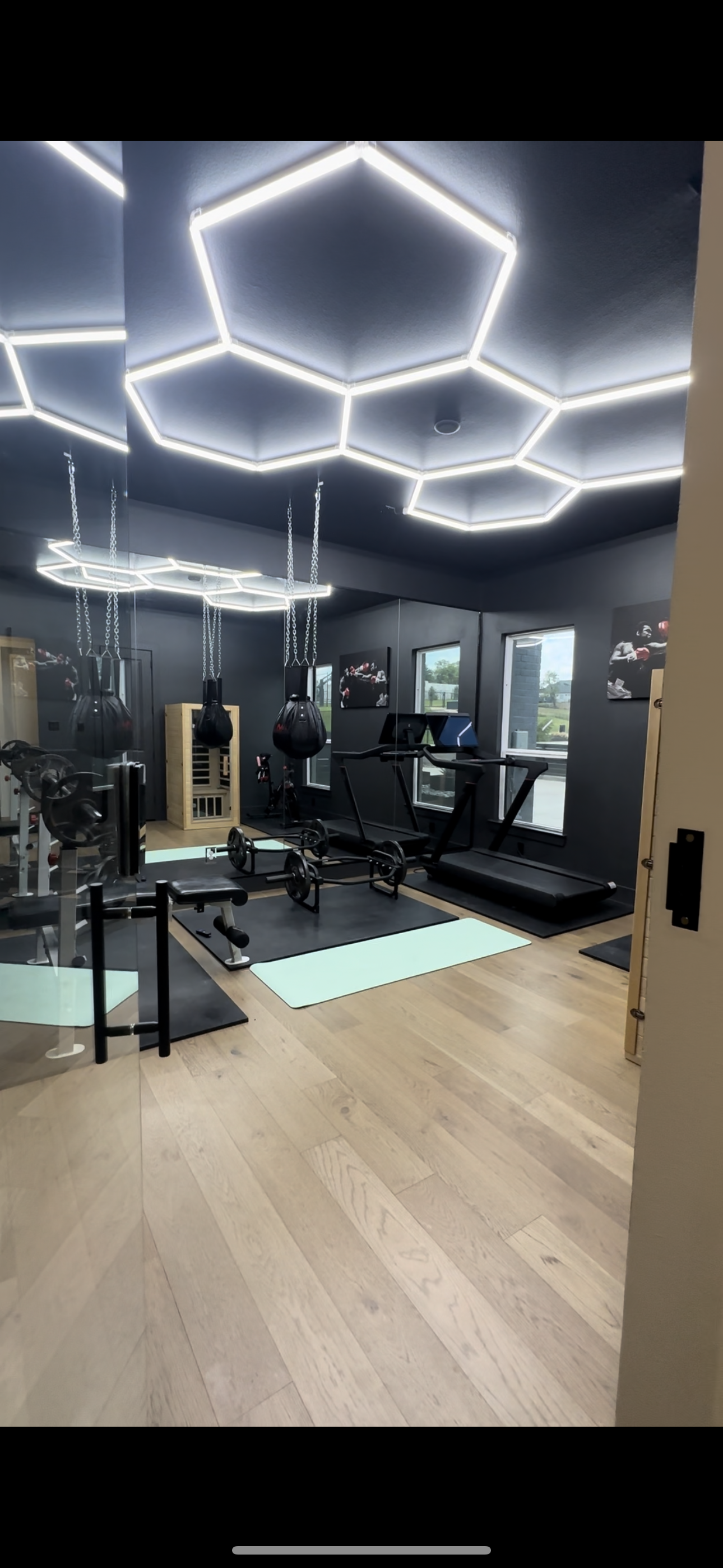 When you have big dreams of a custom, modern, private home gym, who do you call? Sanbear Construction, of course! We removed the standard, single-hung door, modified the doorway, and installed a fully custom, frameless glass door. The catch? The door had to be lockable to prevent possible injury to curious children by the workout equipment. With a little innovation and custom fabrication, we equipped the entrance door with smartkey technology. The room was coated in the bold “Iron Ore” from Sherwin Williams, custom wall-to-wall mirrors were fabricated with aluminum trim, a prefabricated sauna was added, and Hexagon LED lights were installed on the ceiling.